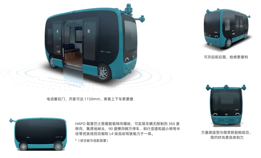 HAPO(HAPPY GO)智慧巴士起步于2017年,滿足目前國內(nèi)最高等級L4的智能駕駛需求,經(jīng)過數(shù)十萬公里的市場檢驗,擁有成熟的量產(chǎn)運營經(jīng)驗。HAPO智慧巴士搭載金龍自主研發(fā)的3.5T線控底盤,更大的承載力滿足更多營運需求;萌動靈巧的獨特造型、寬綽簡約的內(nèi)飾風格令美好深入人心。